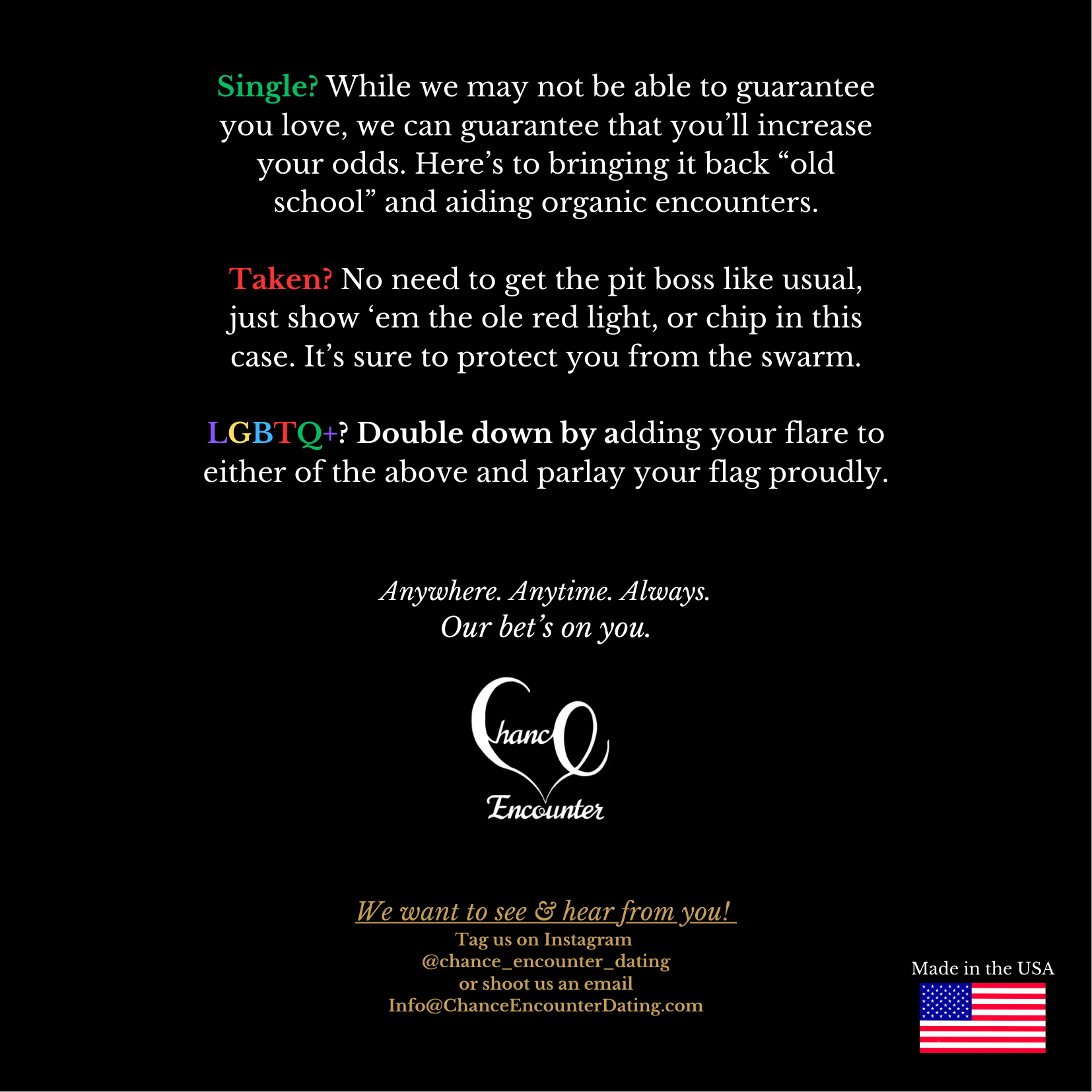 Have you ever been out with a group of friends or a friend of the opposite sex, and looked around wishing you could easily tell who was single or who was taken? Well, look no further than Chance Encounter. How does it work? Each package contains a single and taken indicator for all seasons of life. Simply display the applicable color on your drinkware while out & about then allow natural curiosity to spark conversation.